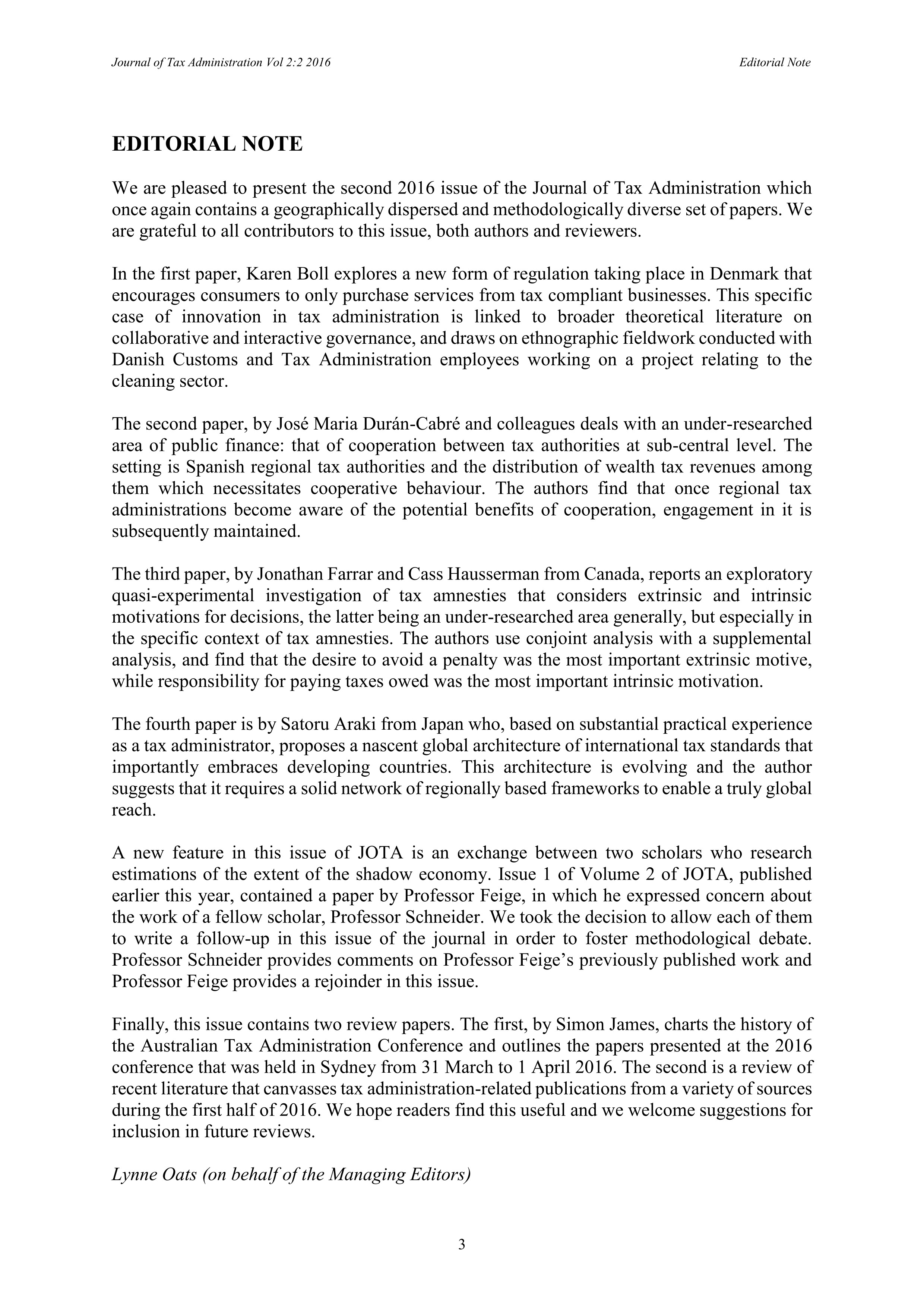 This issue of the Journal of Tax Administration contains a geographically dispersed and methodologically diverse set of papers, together with an exchange between two scholars who research estimations of the extent of the shadow economy, and two review papers: